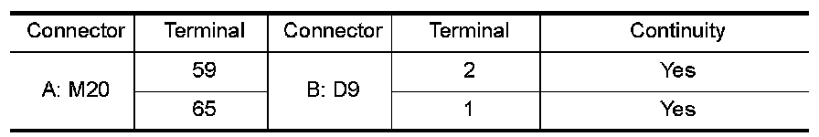 3. Check continuity between BCM connector M20 (A) terminals 59, 65 and front door lock assembly LH (actuator) connector D9 (B) terminals 1, 2.