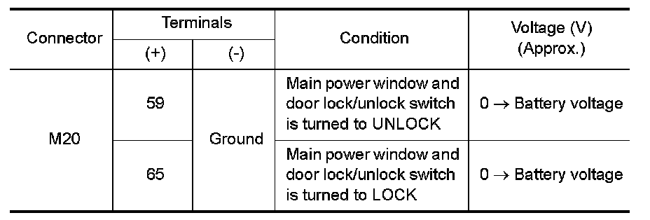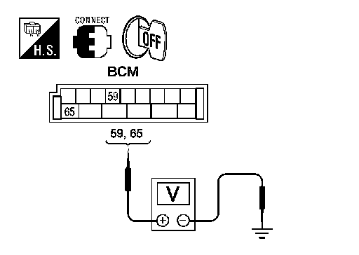 2. Check voltage between BCM connector M20 terminals 59, 65 and ground.