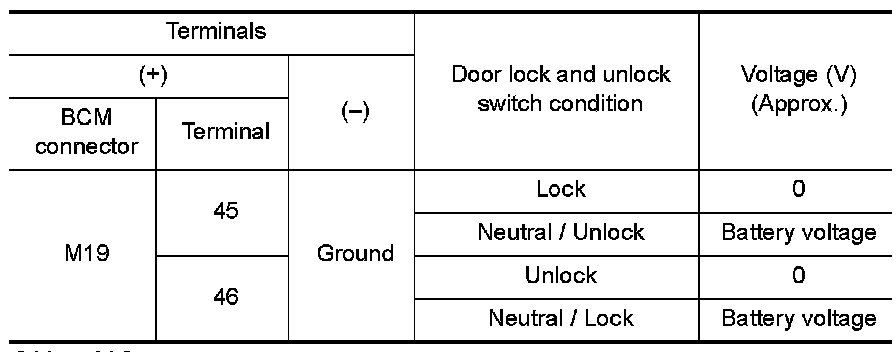 4. Check continuity between BCM connector M19 (A) terminal 46 and door lock/unlock switch LH connector