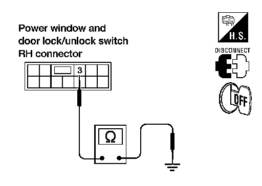 3. Check continuity between power window and door lock/unlock switch RH connector D104 terminal 3 and ground
