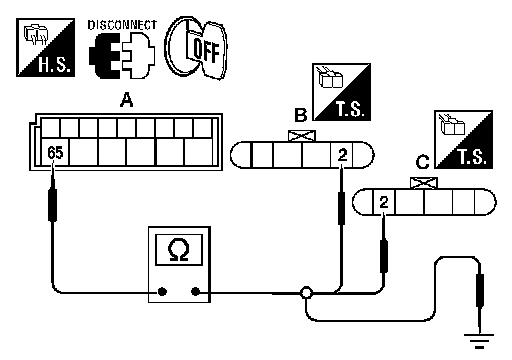 4. Check continuity between BCM connector M20 (A) terminal 65 and body ground.