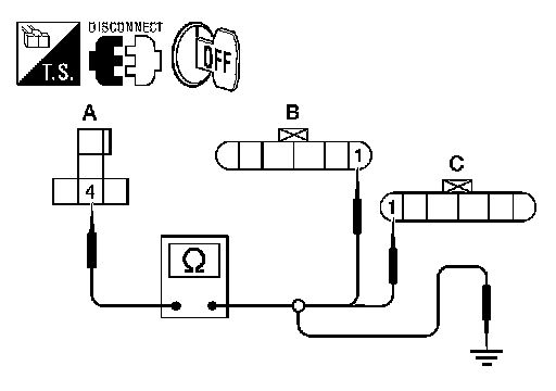 3. Check continuity between passenger select unlock relay connector M14 (A) terminal 4 and ground.