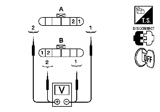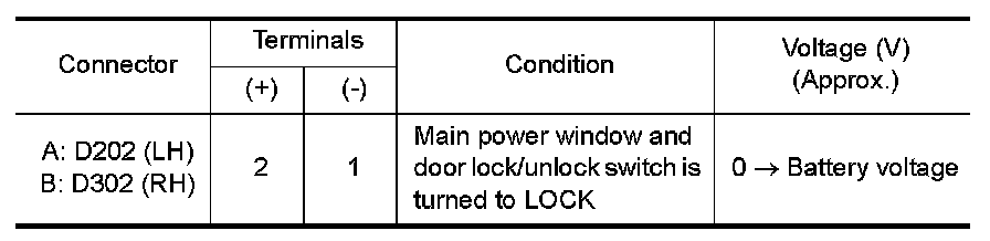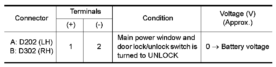 D202 (A) or rear door lock actuator connector RH D302 (B) terminals 1 and 2.