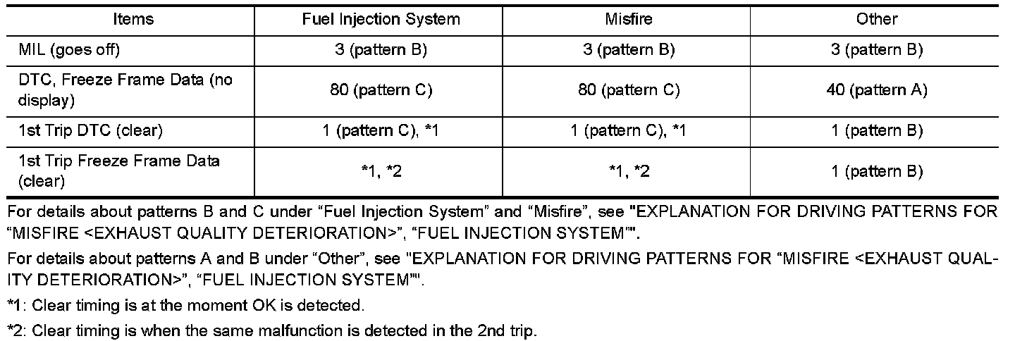 - The DTC and the freeze frame data will be stored until the vehicle is driven 40 times (driving pattern A) without the same malfunction recurring (except for Misfire and Fuel Injection System). For Misfire and Fuel Injection System, the DTC and freeze frame data will be stored until the vehicle is driven 80 times (driving pattern