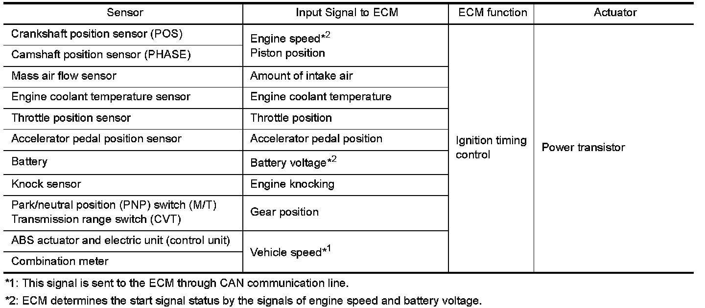 The ECM receives information such as the injection pulse width and camshaft position sensor (PHASE) signal. Computing this information, ignition signals are transmitted to the power transistor.