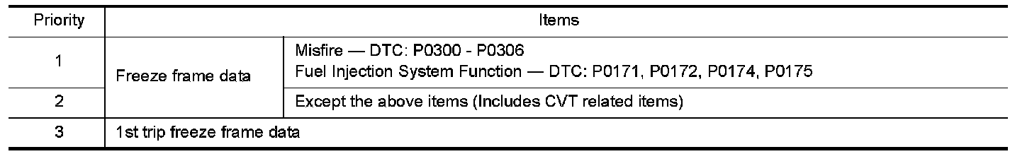 Only one set of freeze frame data (either 1st trip freeze frame data or freeze frame data) can be stored in the ECM. 1st trip freeze frame data is stored in the ECM memory along with the 1st trip DTC. There is no priority for 1st trip freeze frame data, and it is updated each time a different 1st trip DTC is detected. However, once freeze frame data (2nd trip detection/MIL on) is stored in the ECM memory, 1st trip freeze frame data is no longer stored. Remember, only one set of freeze frame data can be stored in the ECM. The ECM has the following priorities to update the data.