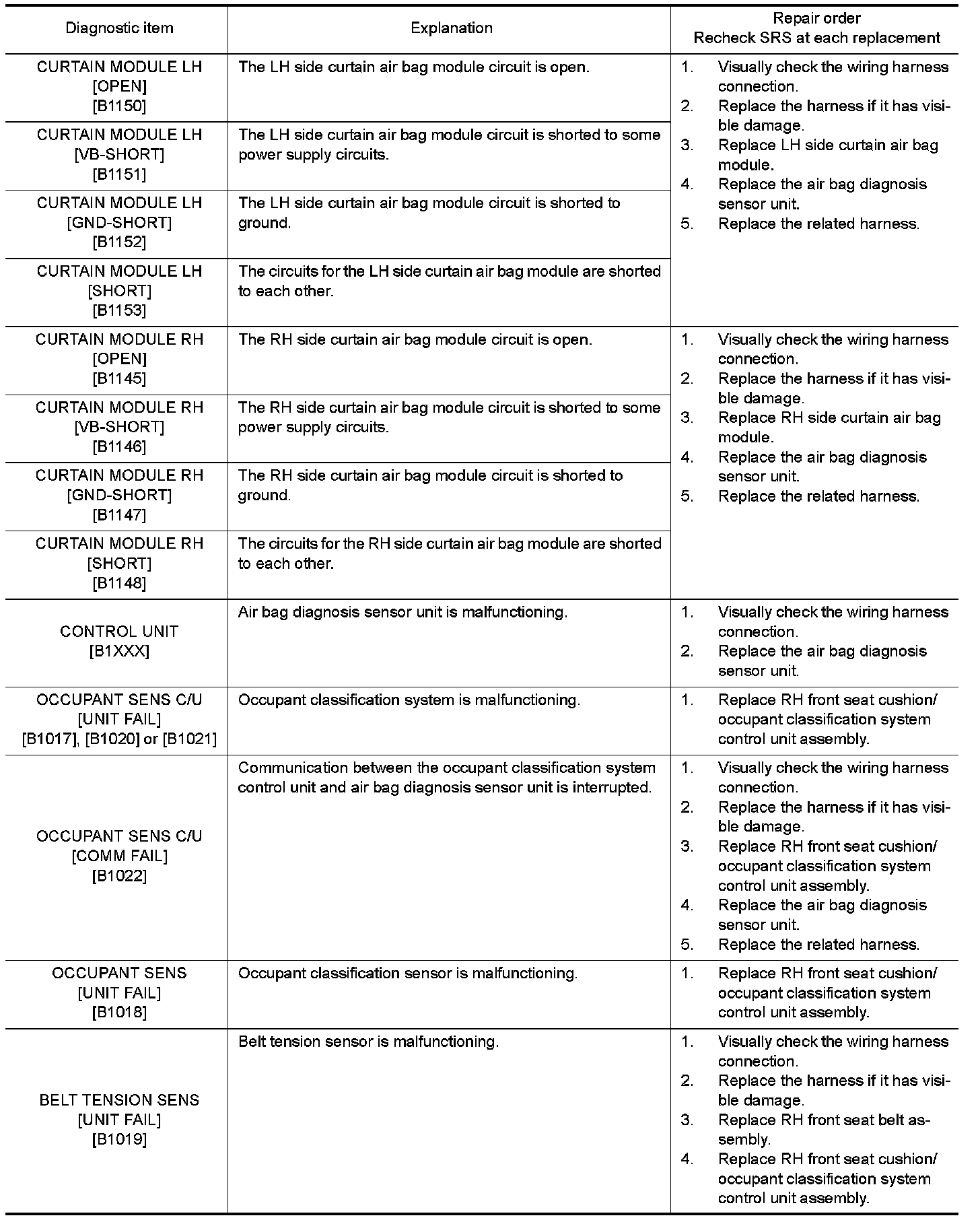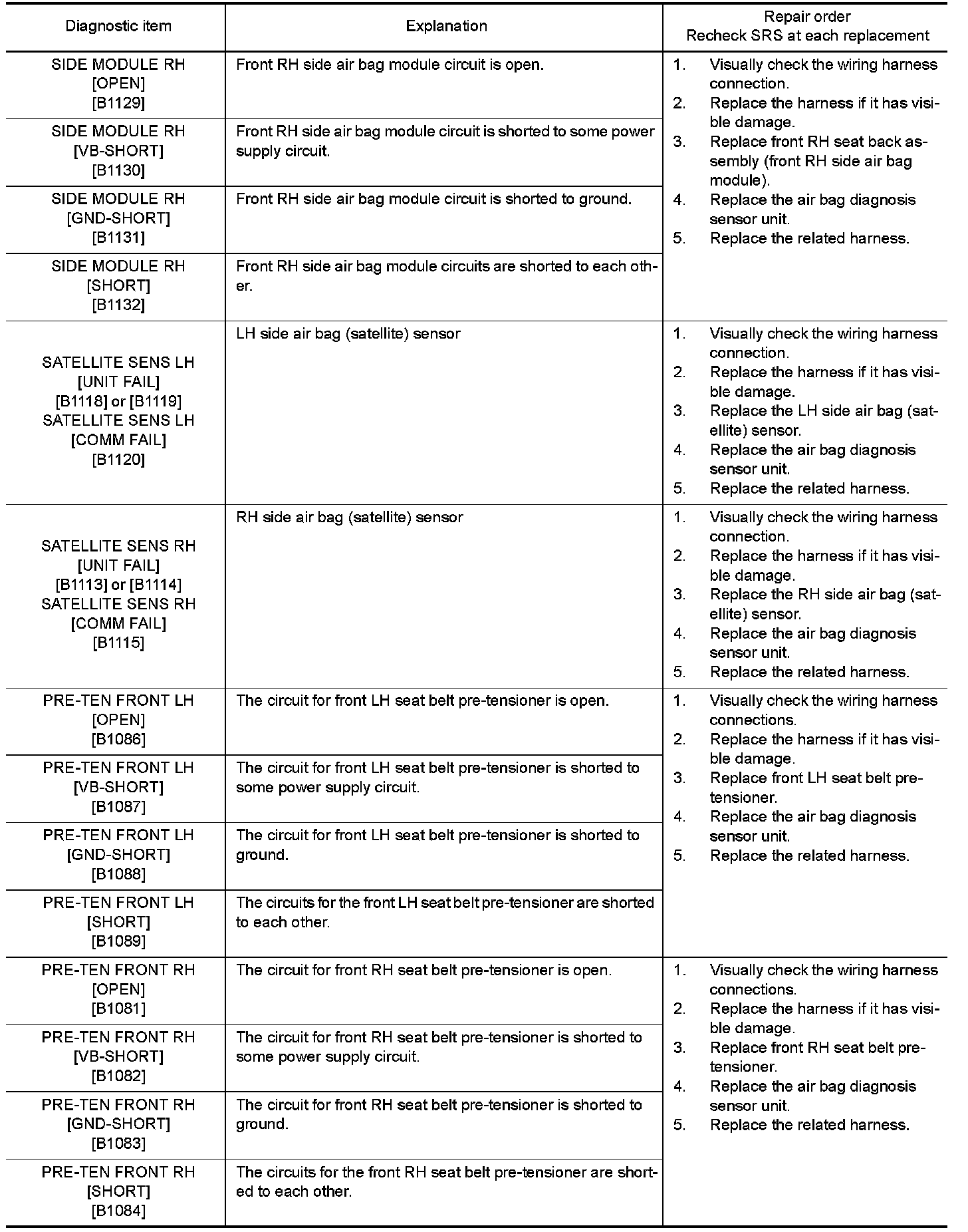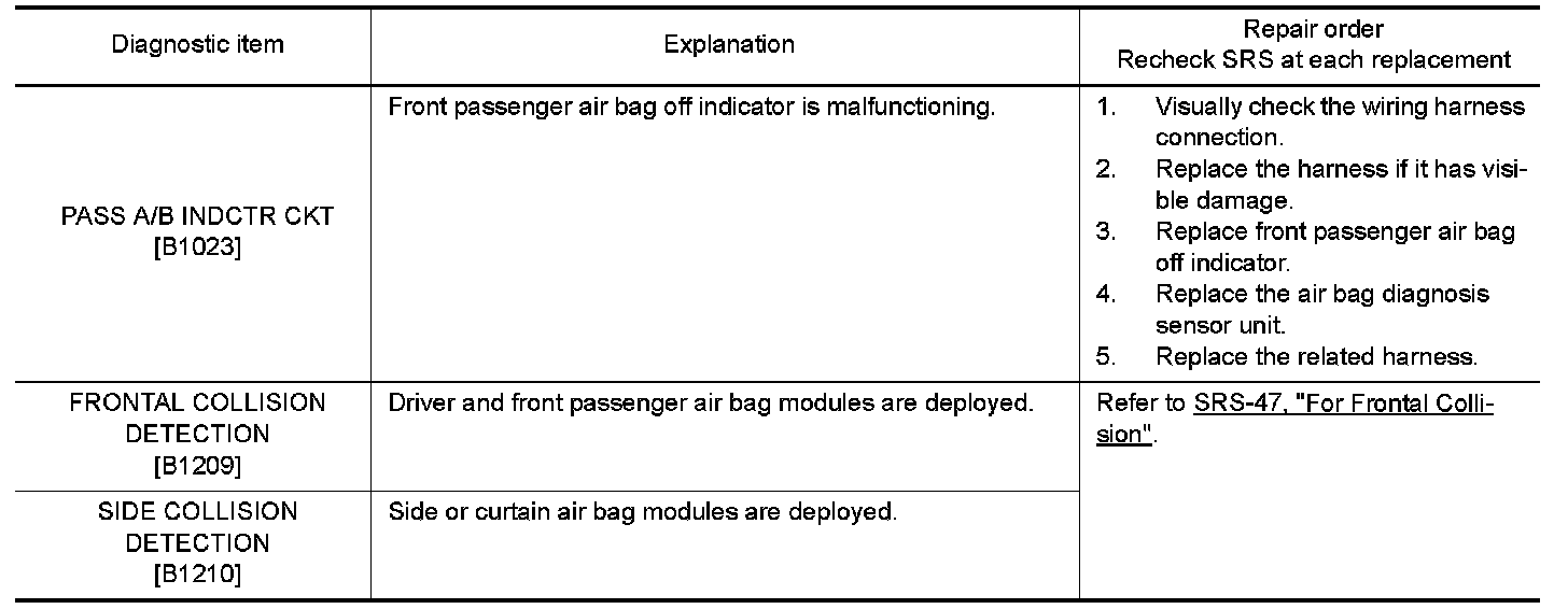 Follow the procedures in numerical order when performing repairs. Confirm whether the repair has been successful using air bag warning lamp or CONSULT-III after each repair. If malfunction is still observed, proceed to the next step. When malfunction has been eliminated, further repair work is not required.