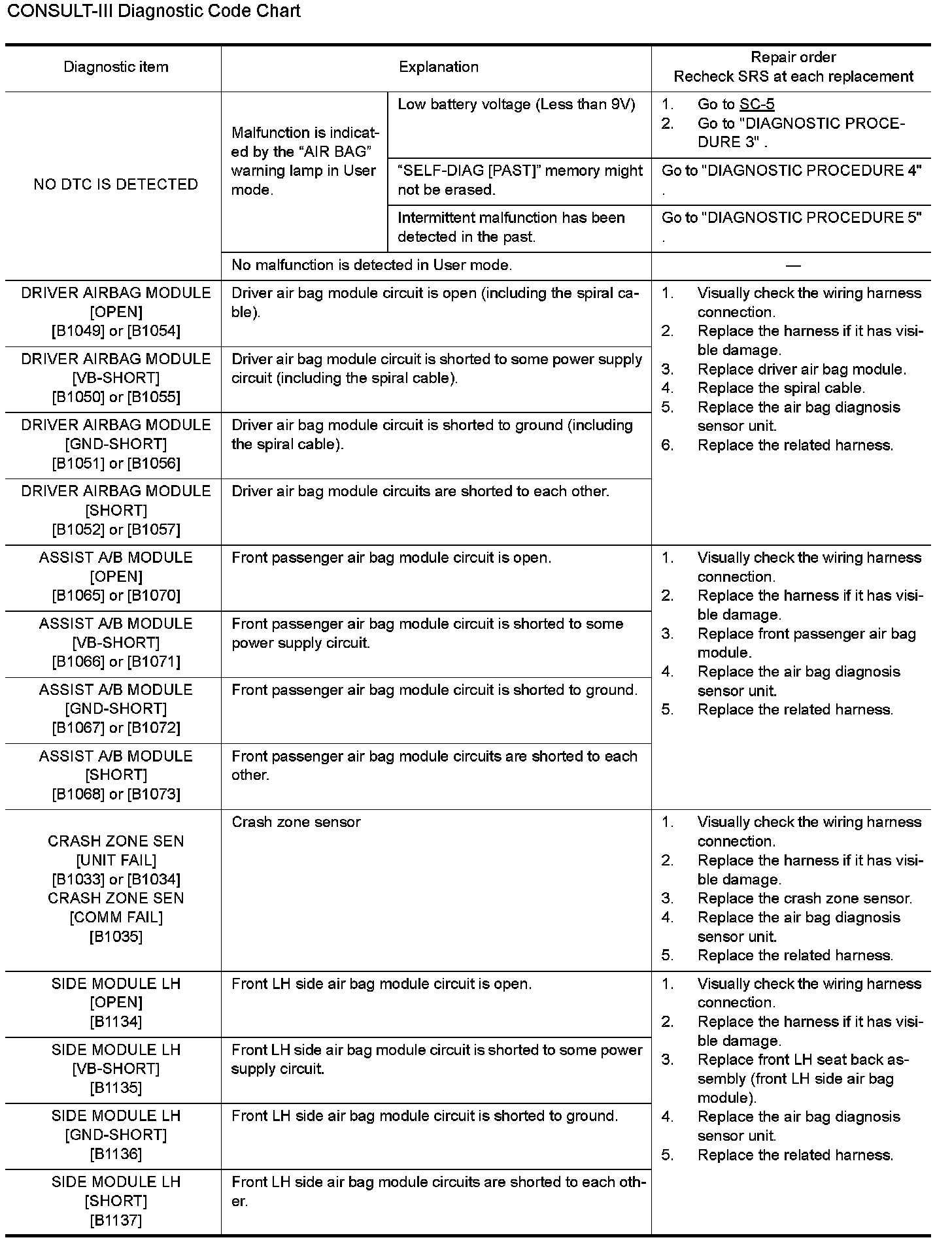 8. Repair the system as outlined by the "Repair order" in "CONSULT-III Diagnostic Code Chart", that corresponds to the self-diagnostic result. For replacement procedure of component parts, refer to the Removal and Installation procedure for the appropriate component.