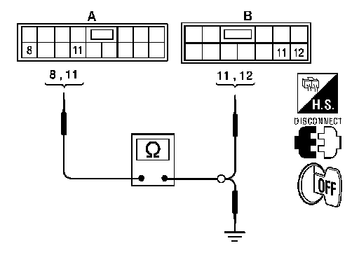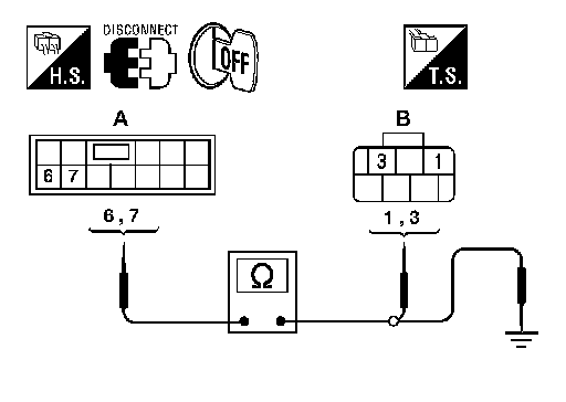 2. Check continuity between main power window and door lock/unlock switch and power window connector (A) and door lock/unlock switch RH connector (B).