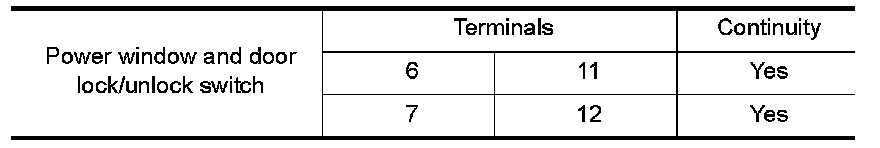 Check continuity between power window and door lock/unlock switch RH terminals.