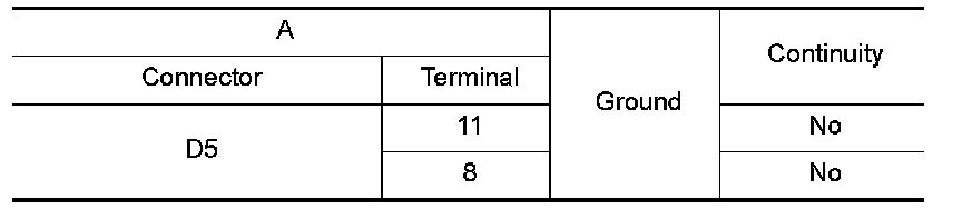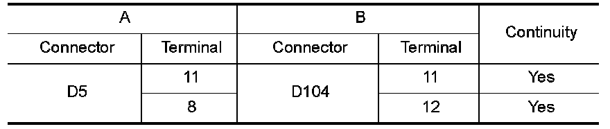 3. Check continuity between power window and door lock/unlock switch RH connector D104 (A) terminals 6, 7 and ground.