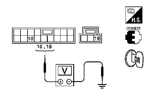 2. Check voltage between main power window and door lock/unlock switch connector D5 terminal 10, D11 terminal 19 and ground.