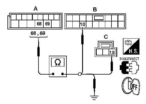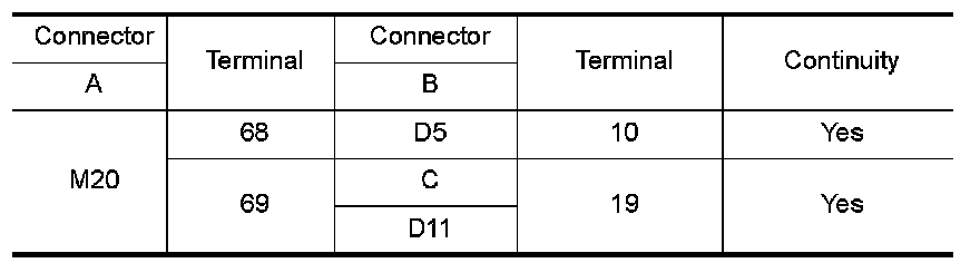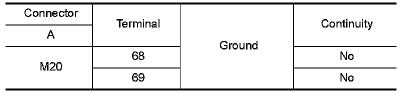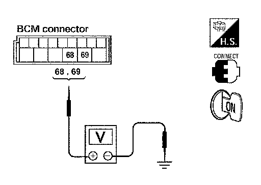 3. Check voltage between BCM connector M20 terminal 68, 69 and ground.