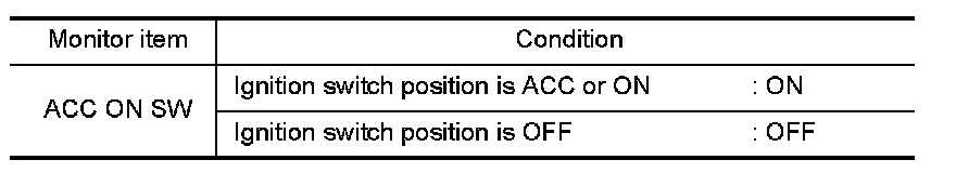 Check ACC switch ("ACC ON SW") in "DATA MONITOR" mode with CONSULT-III.
