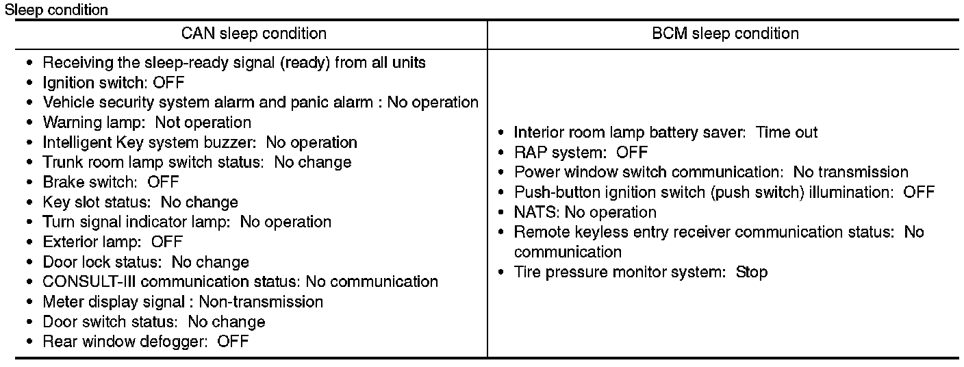 - BCM transmits the sleep wake up signal (sleep) to each unit when all of the CAN sleep conditions are fulfilled.