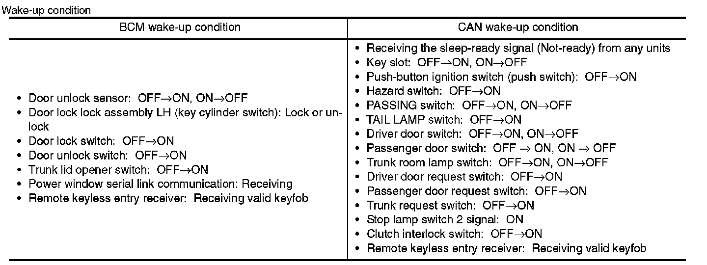 - BCM transmits the sleep wake up signal (wake up) to each unit when any of the CAN wake-up conditions is fulfilled. It changes from the low power consumption mode or the CAN communication sleep mode to the normal mode.