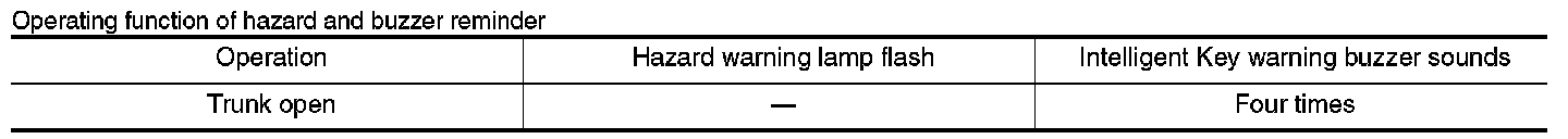 - When trunk is opened with request switch or remote controller button operation, the hazard lamps flash and the Intelligent Key warning buzzer or horns sound (hazard and buzzer/horn reminder function).