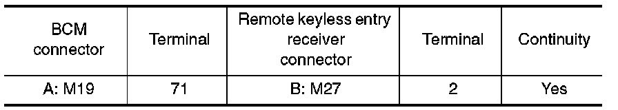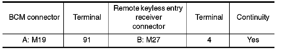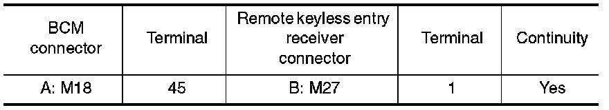 1. Check continuity between BCM connector and remote keyless entry receiver connector.