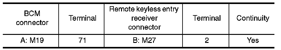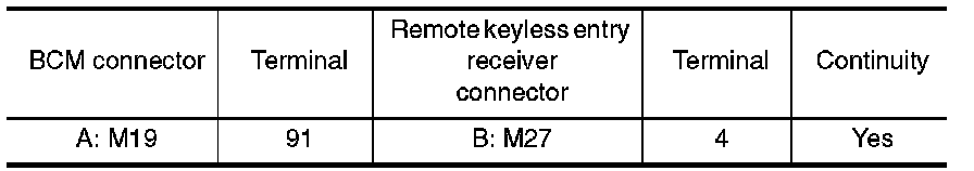 1. Check continuity between BCM connector and remote keyless entry receiver connector.