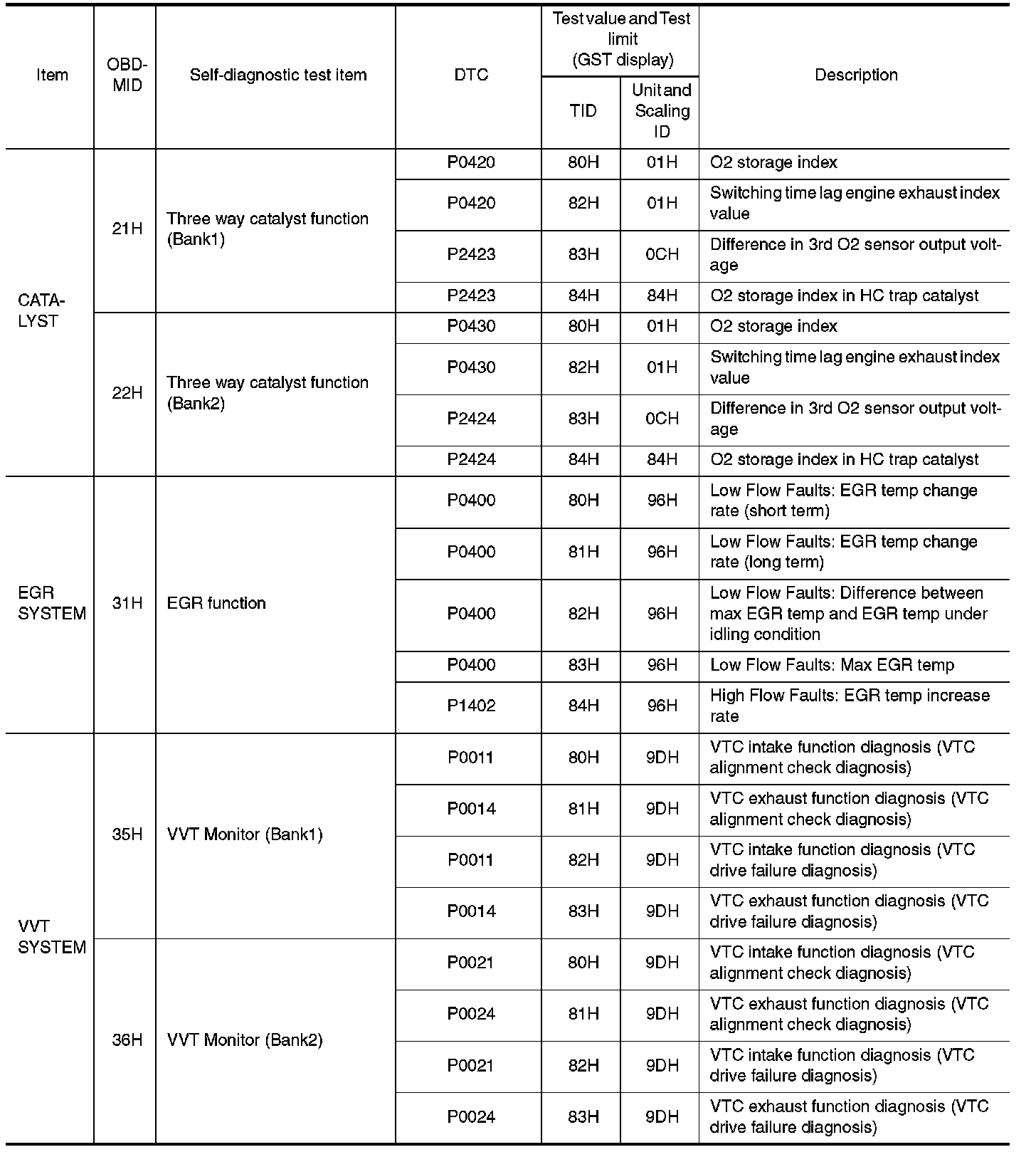 The items of the test value and test limit will be displayed with GST screen which items are provided by the ECM. (e.g., if bank 2 is not applied on this vehicle, only the items of bank 1 are displayed)