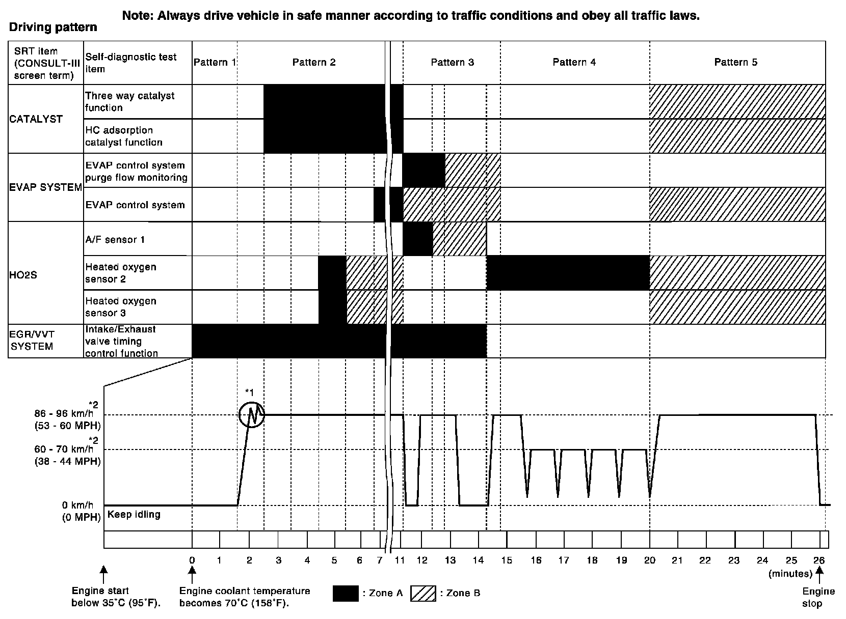 *1: Depress the accelerator pedal until vehicle speed is 90 km/h (56 MPH), then release the accelerator pedal and keep it released for more than 10 seconds. Depress the accelerator pedal until vehicle speed is 90 km/h