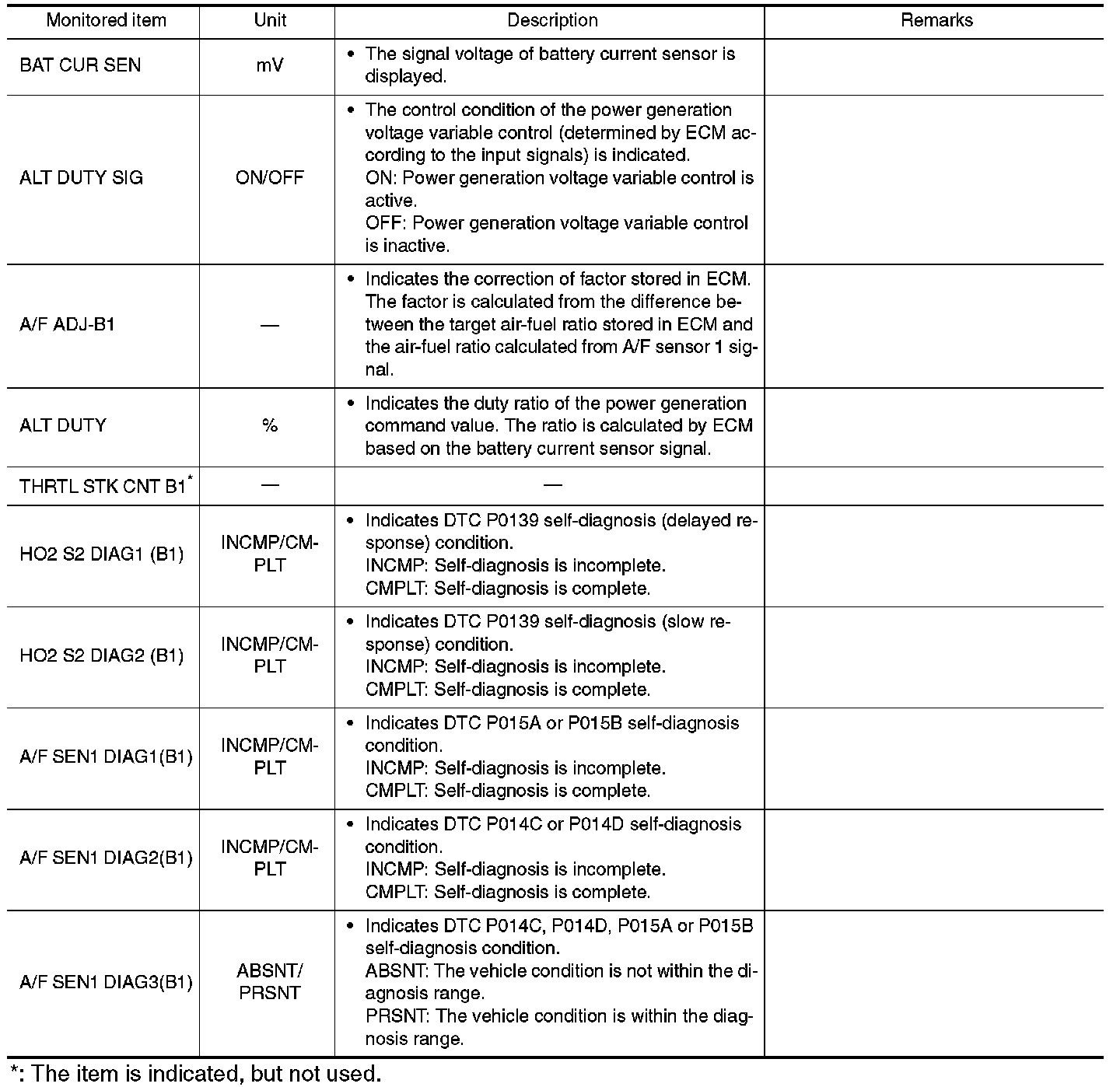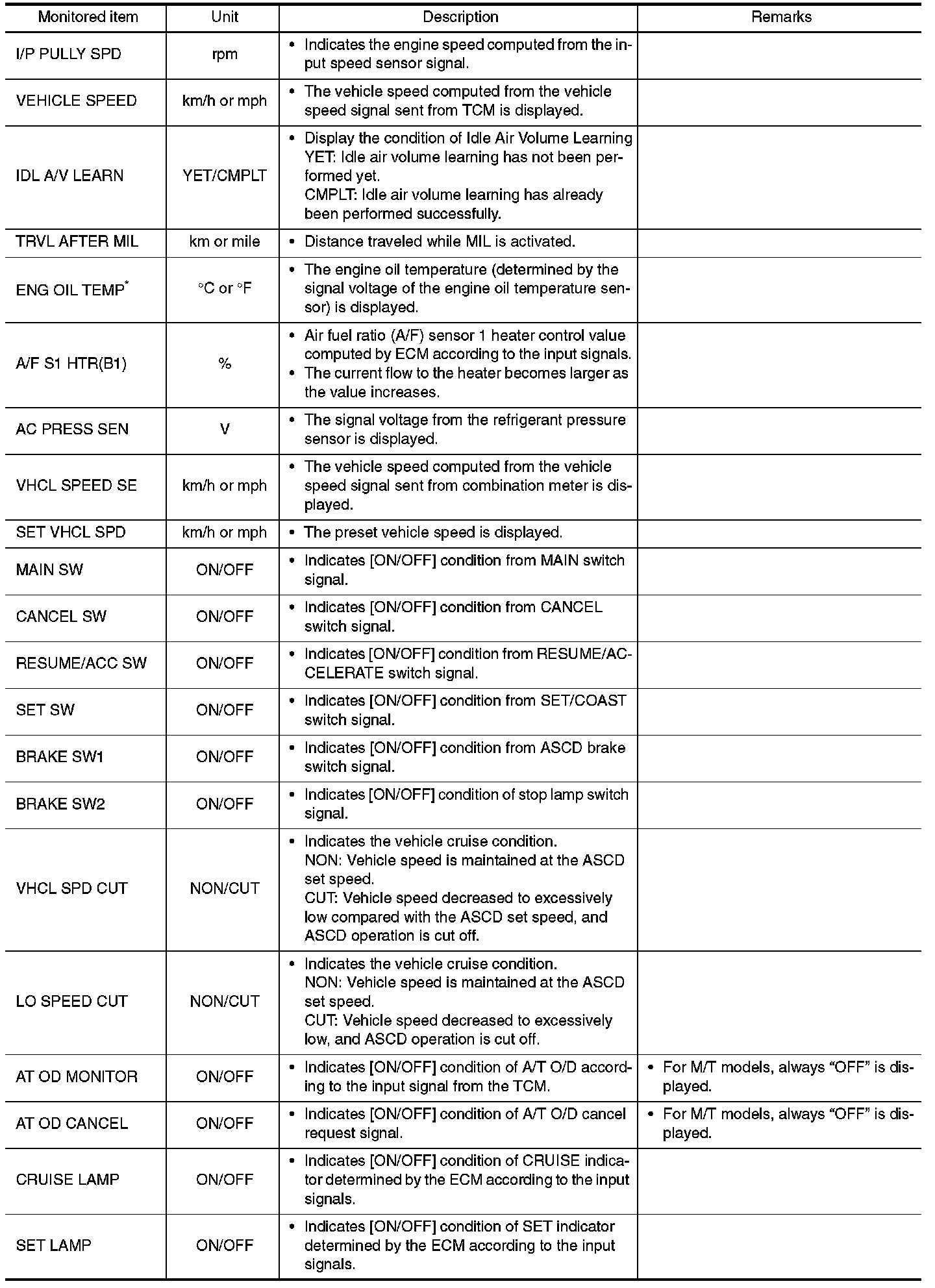 Any monitored item that does not match the vehicle being diagnosed is deleted from the display automatically.
