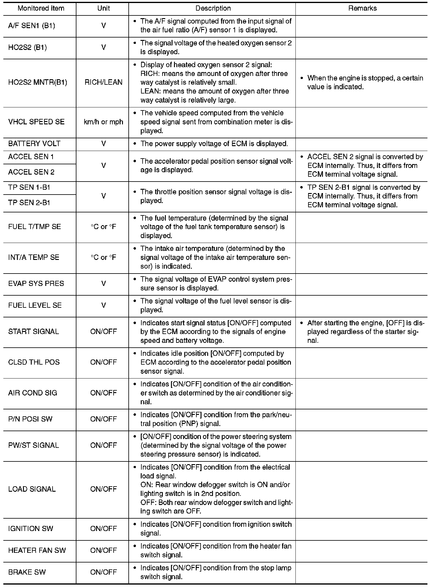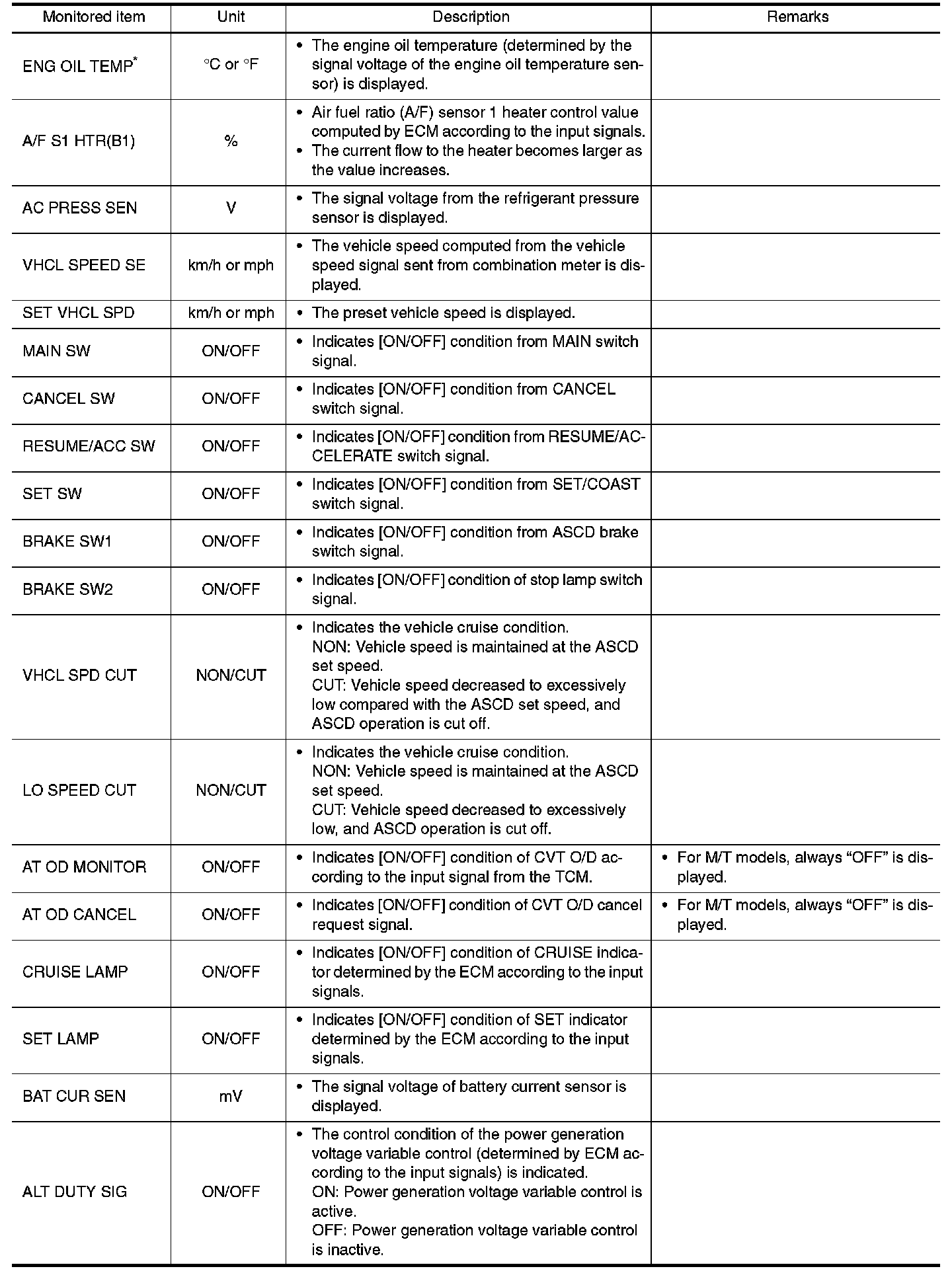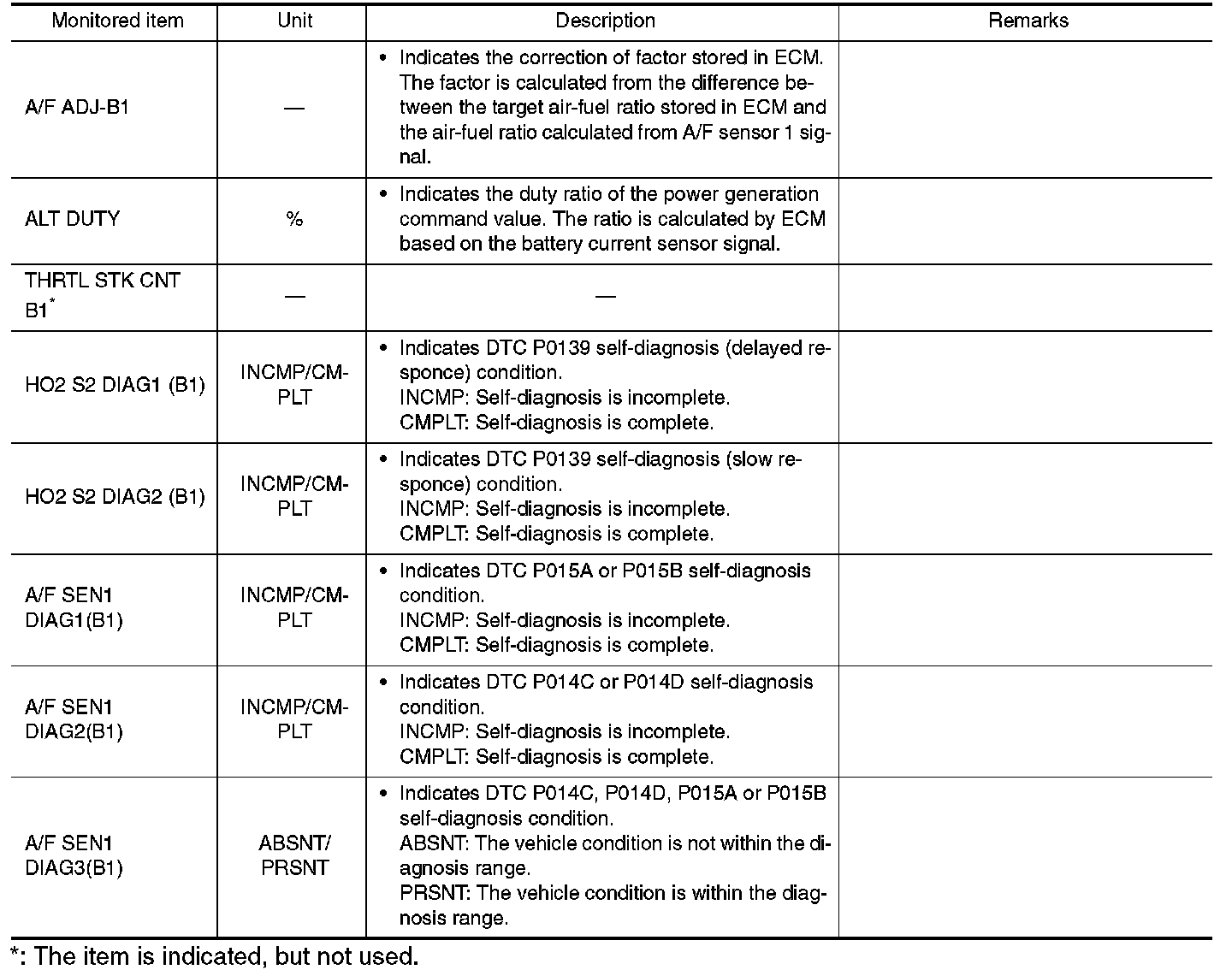 Any monitored item that does not match the vehicle being diagnosed is deleted from the display automatically.