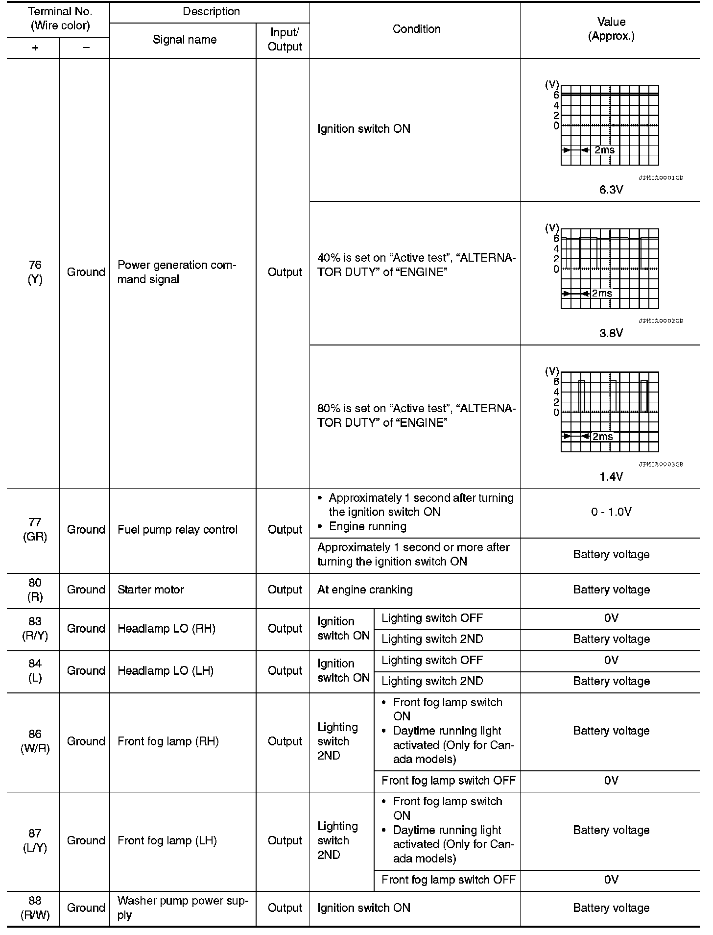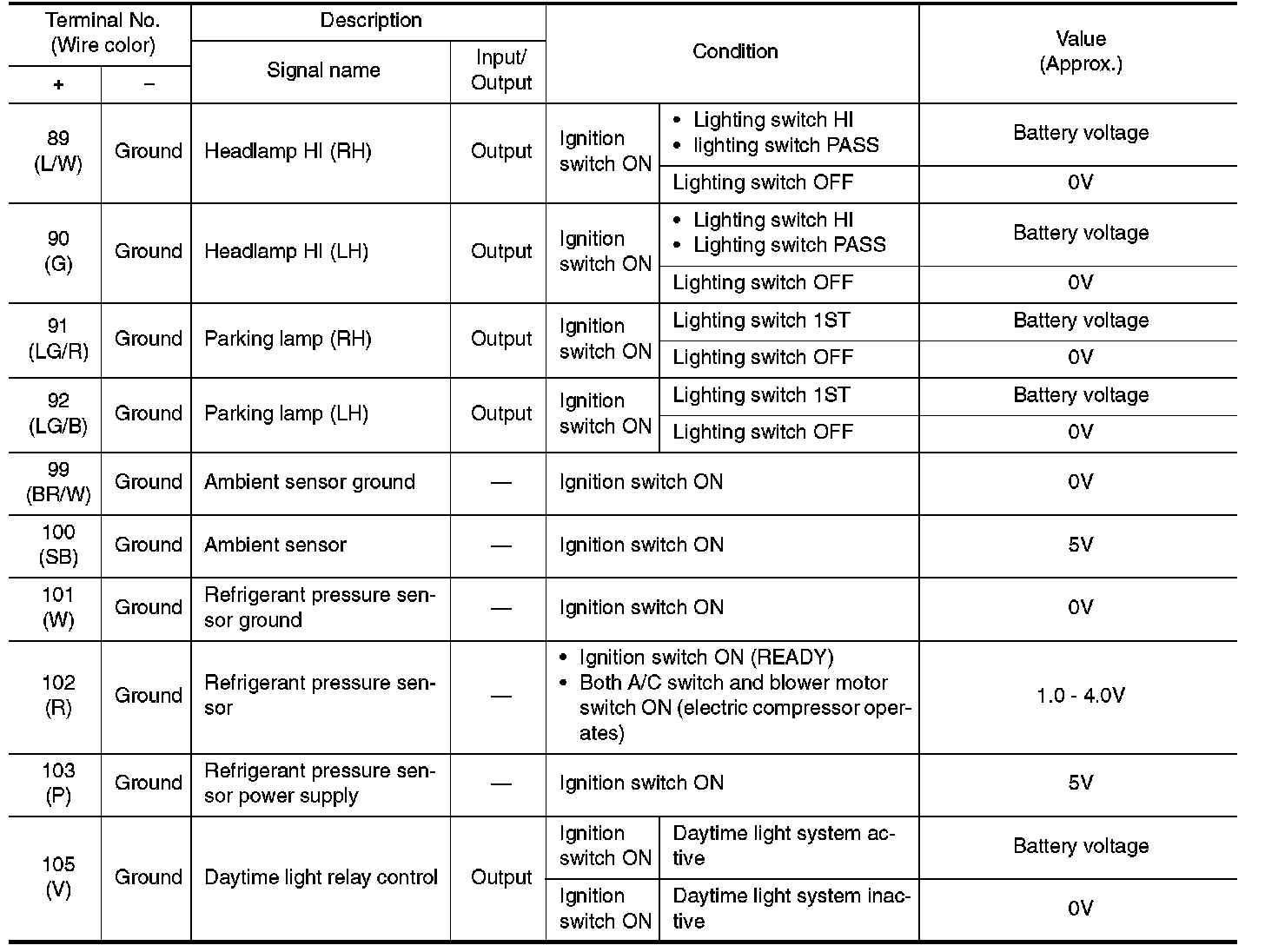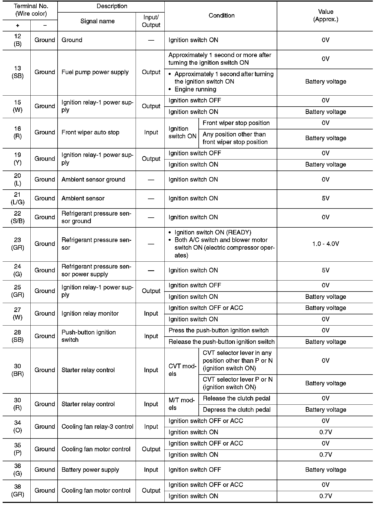 Pinout Values and Diagnostic Parameters