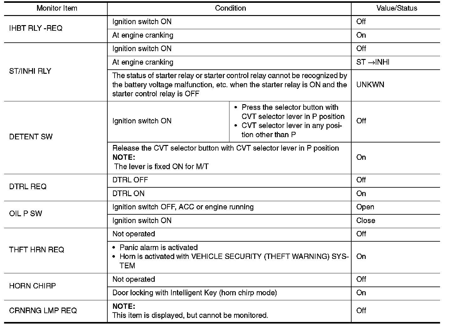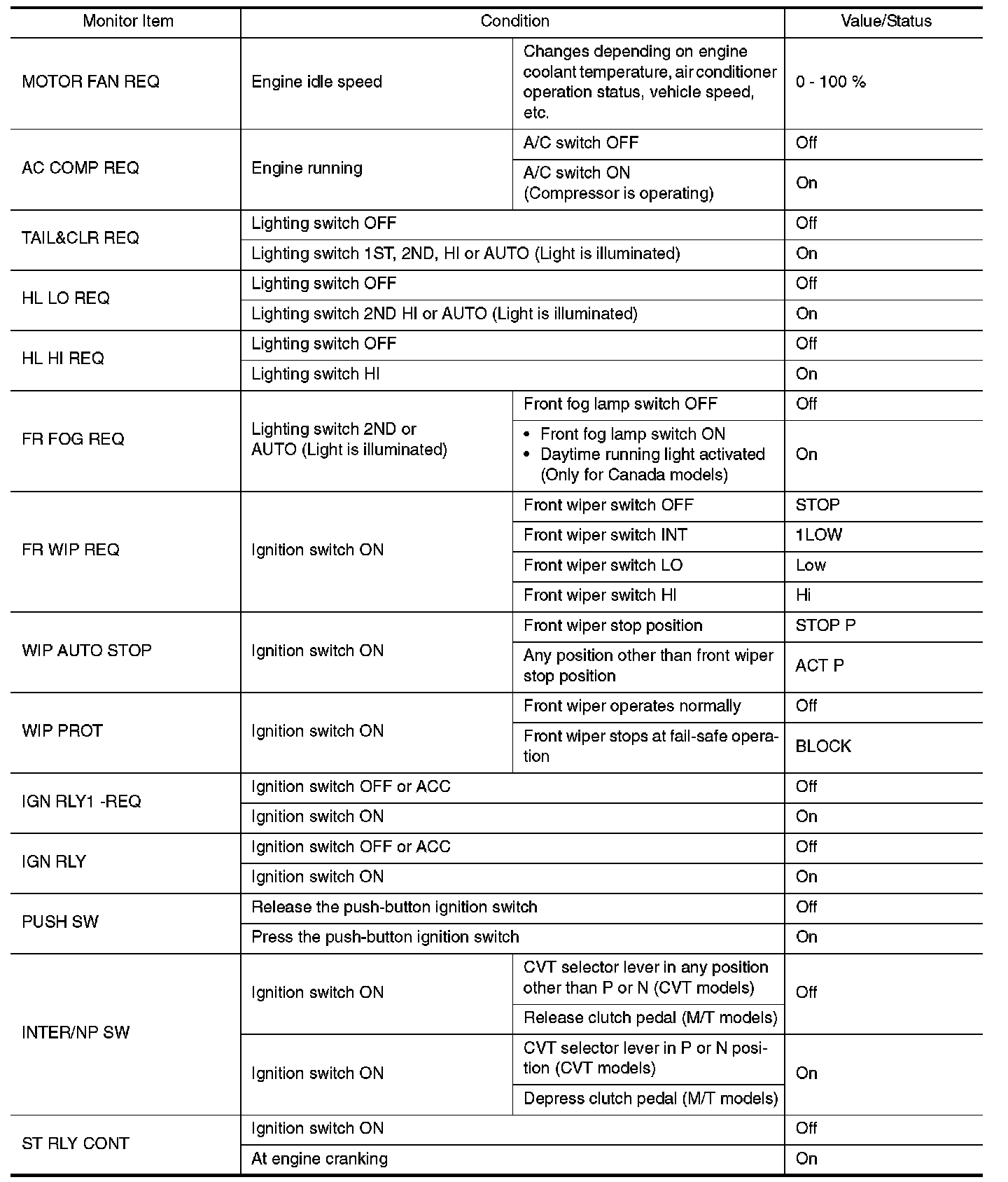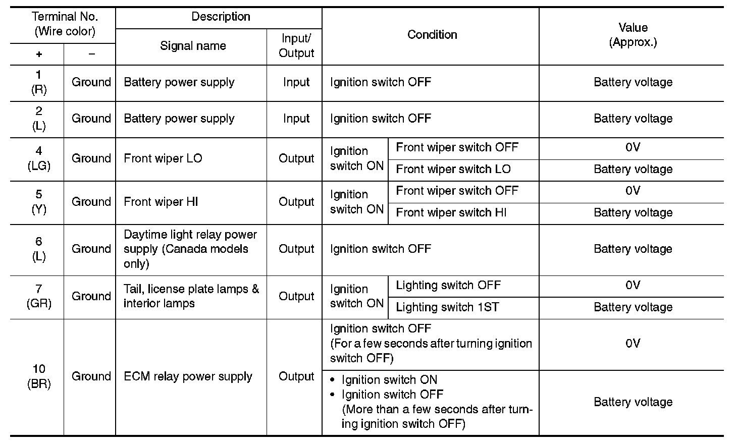 Pinout Values and Diagnostic Parameters