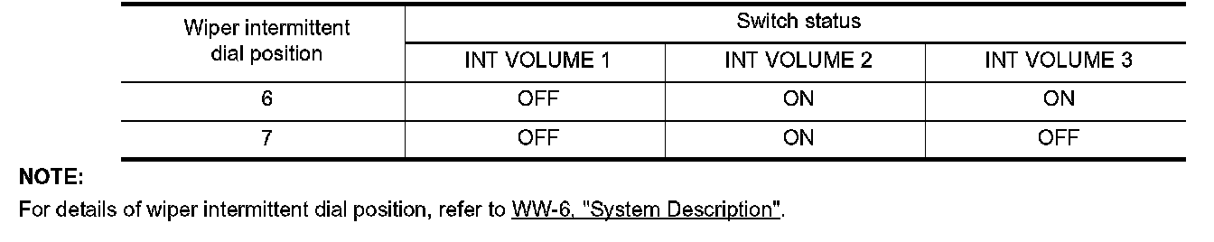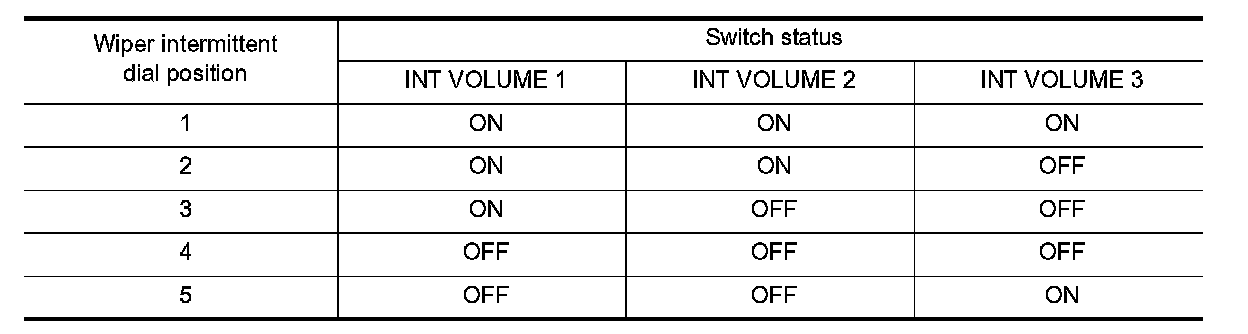 BCM judges the wiper intermittent dial 1 - 7 by the status of INT VOLUME 1, 2 and 3 switches.