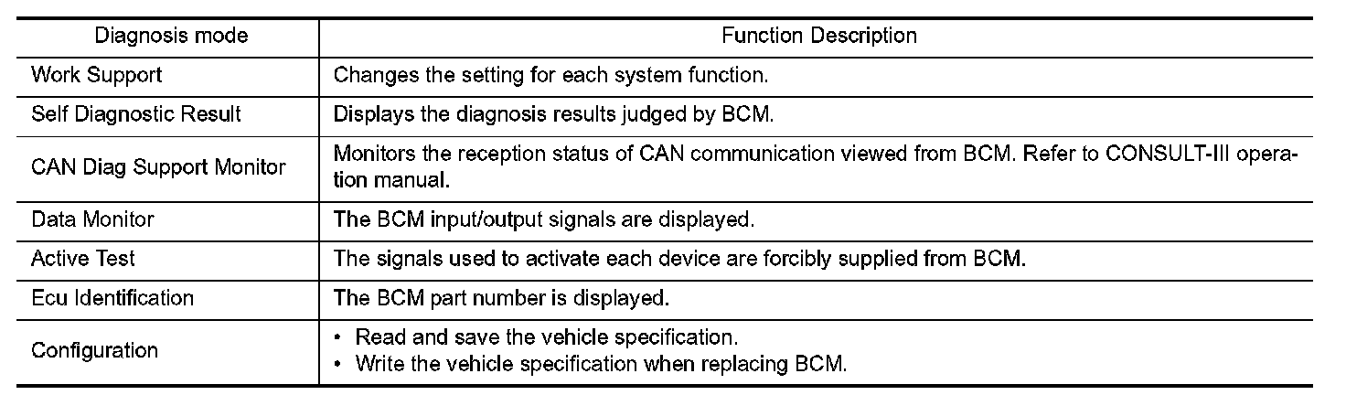 CONSULT-III performs the following functions via CAN communication with BCM.
