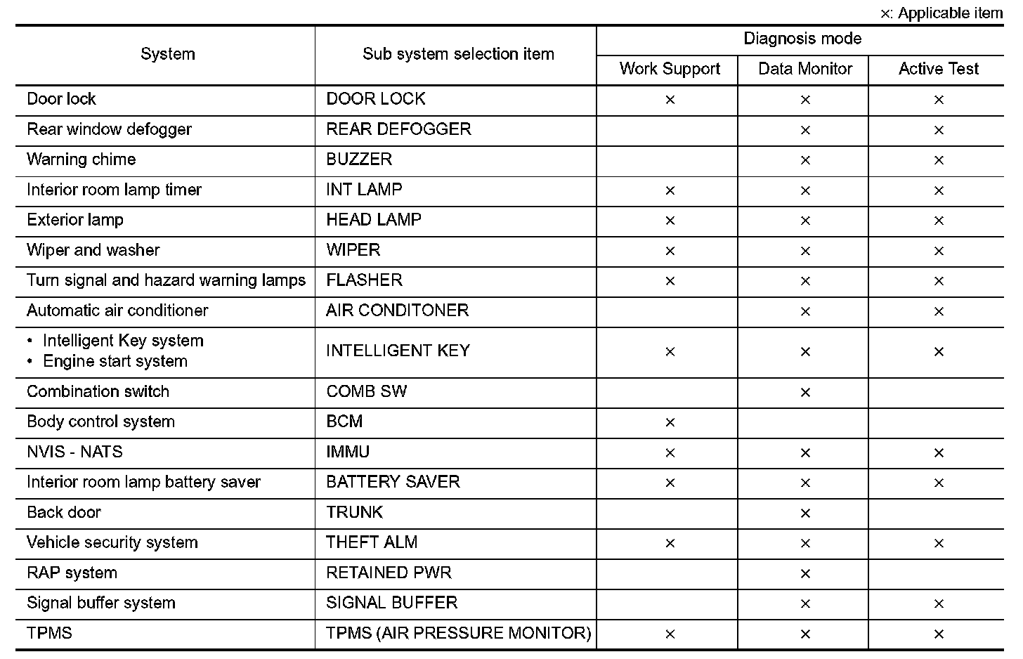 It can perform the diagnosis modes except the following for all sub system selection items.