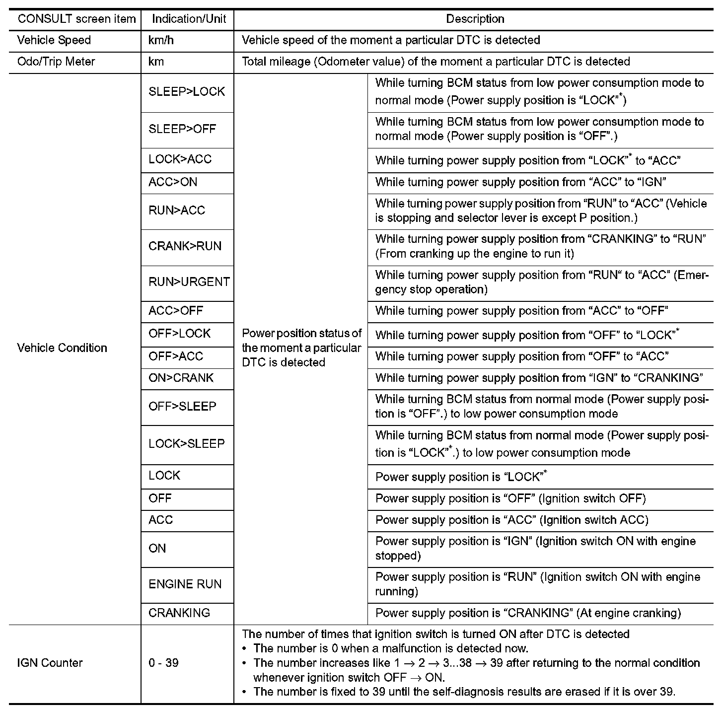 *: Power position shifts to "LOCK" from "OFF", when ignition switch is in the OFF position, selector lever is in the P position (CVT models), and any of the following conditions are met.
