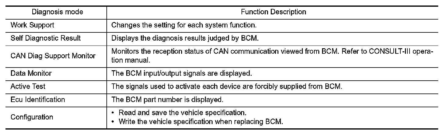 CONSULT-III performs the following functions via CAN communication with BCM.