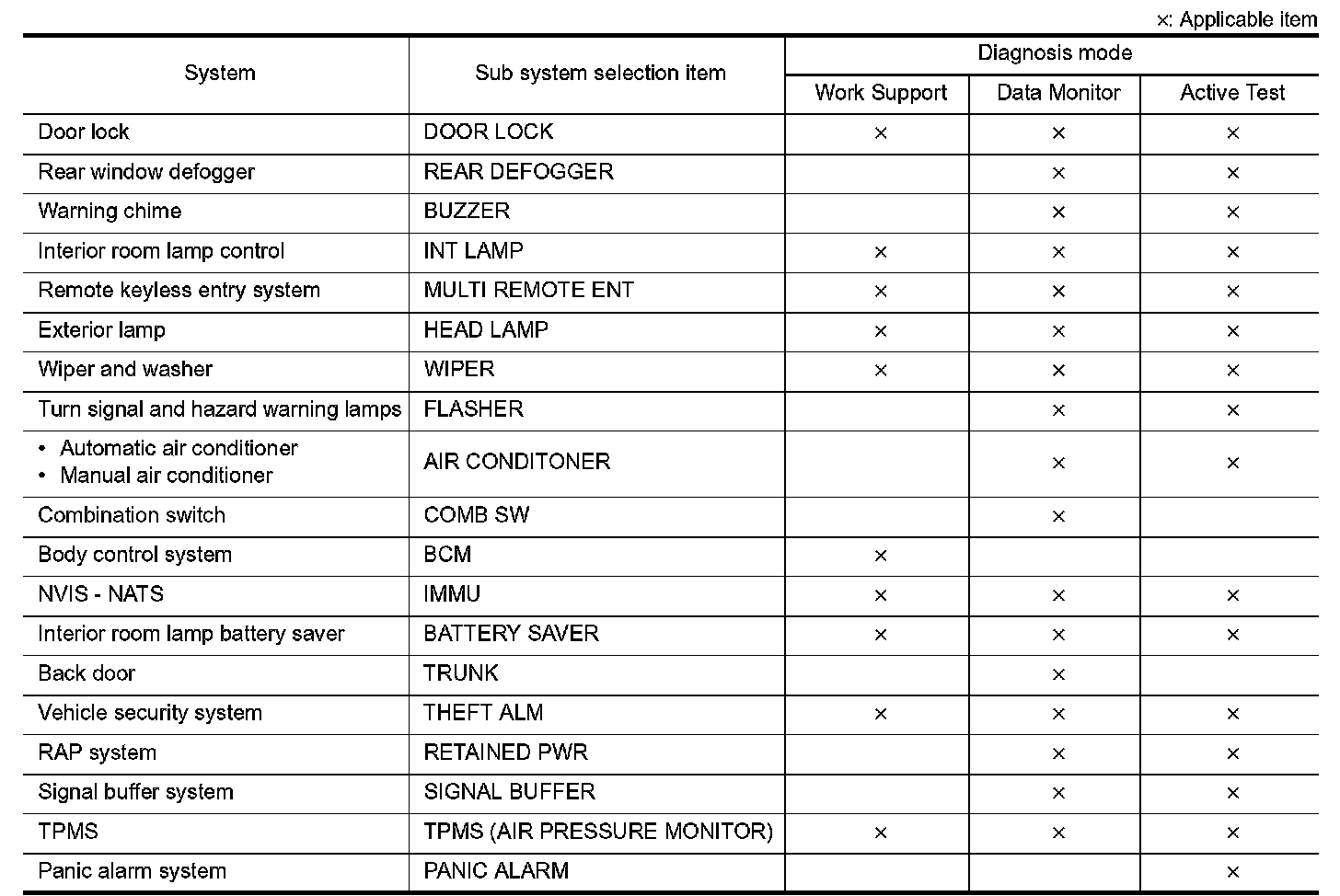 It can perform the diagnosis modes except the following for all sub system selection items.