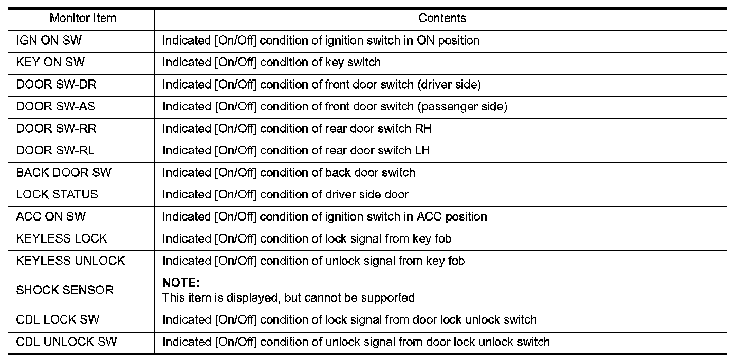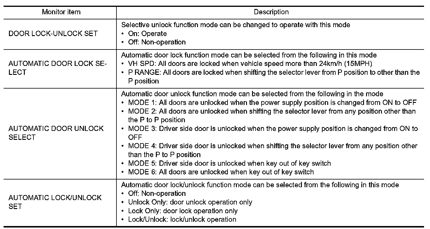 DOOR LOCK : CONSULT-III Function (BCM - DOOR LOCK)