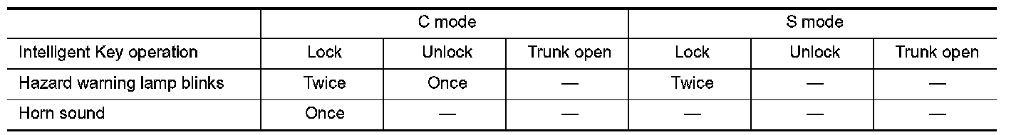When LOCK and UNLOCK signals are sent from the Intelligent Key for more than 2 seconds at the same time, the hazard and horn reminder mode is changed and hazard warning lamp blinks and horn sounds as per the following items: