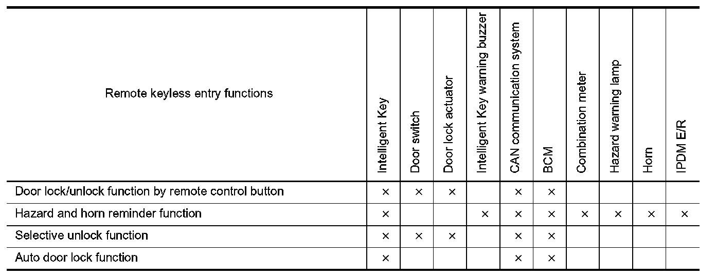 When doors are locked or unlocked by Intelligent Key, BCM blinks hazard warning lamps as a reminder and transmits horn chirp signal to IPDM E/R. IPDM E/R sounds horn as a reminder.