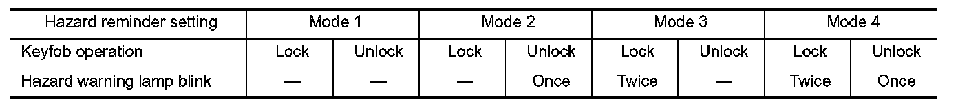 Hazard reminder has modes 1, 2, 3 and 4, and horn reminder can be turned ON/OFF with any lock mode.