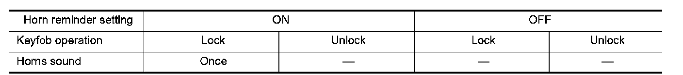 When LOCK and UNLOCK signals are sent from the Intelligent Key for more than 2 seconds at the same time, the hazard and horn reminder mode is changed and hazard warning lamp blinks and horn sounds as follows:
