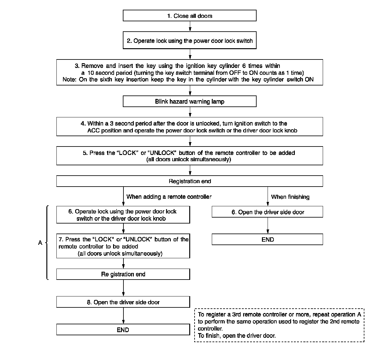 - Always remove and insert key slowly and carefully within a 10 second period. If this procedure is performed too quickly, remote controller ID registration mode may not be entered.