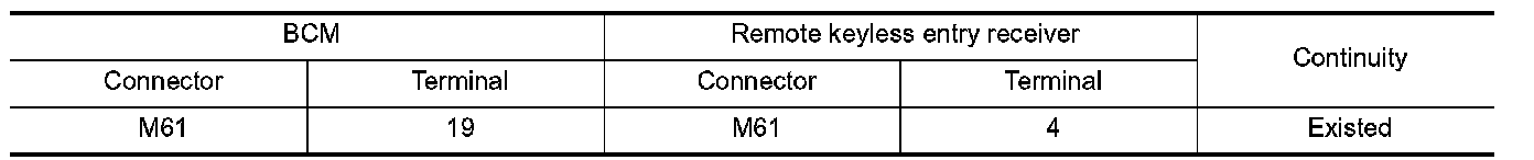 2. Check continuity between BCM harness connector and remote keyless entry receiver harness connector.