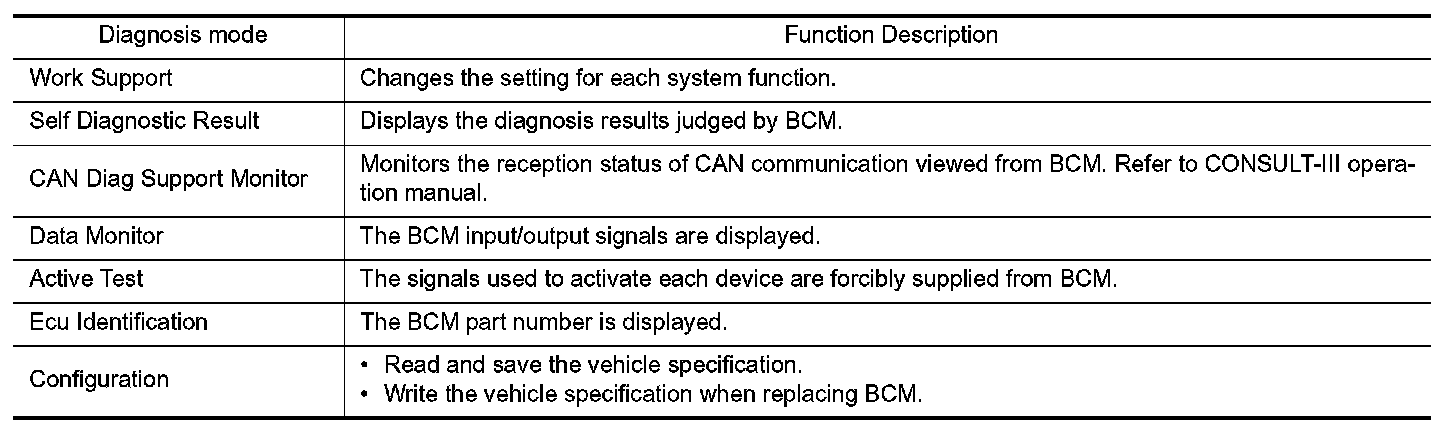 CONSULT-III performs the following functions via CAN communication with BCM.