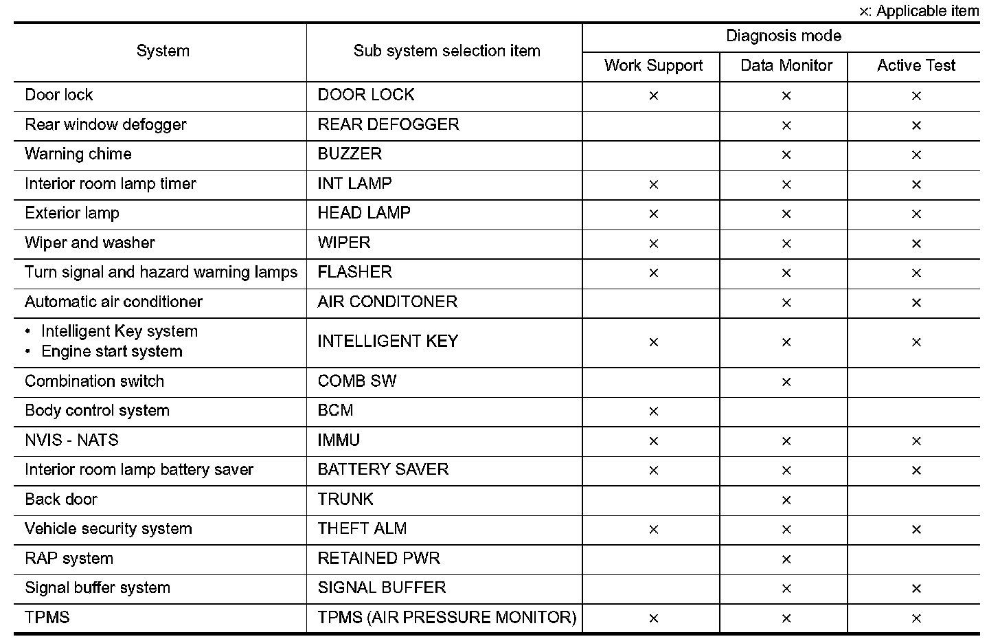 It can perform the diagnosis modes except the following for all sub system selection items.