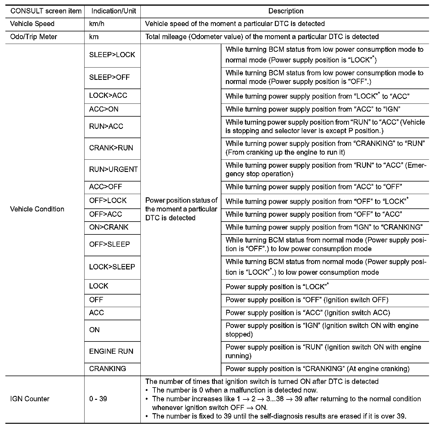 The BCM records the following vehicle condition at the time a particular DTC is detected, and displays on
