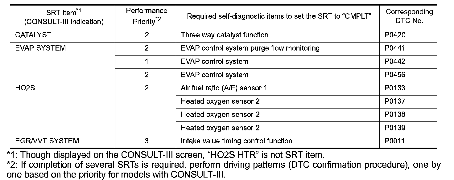 *2: If completion of several SRTs is required, perform driving patterns (DTC confirmation procedure), one by one based on the priority for models with CONSULT-III.