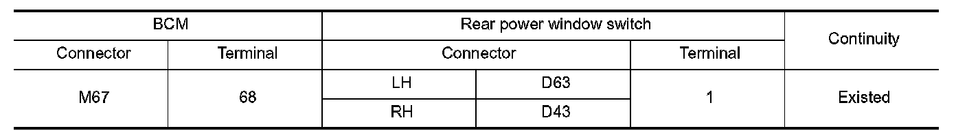 3. Check continuity between BCM harness connector and rear power window switch harness connector.