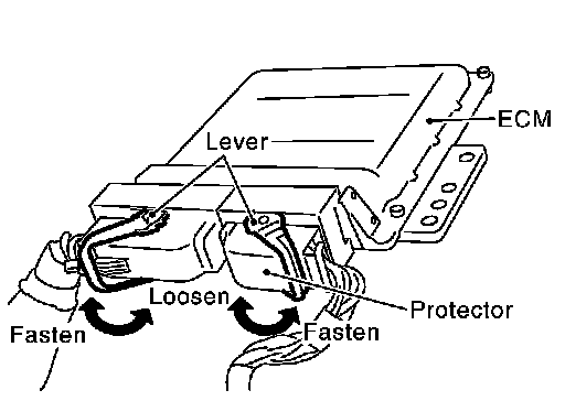 - When connecting ECM harness connector, fasten it securely with a lever as far as it will go as shown in the figure.