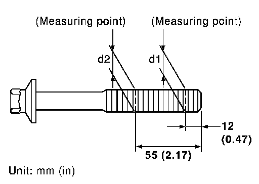 Cylinder head bolts are tightened by plastic zone tightening method. Whenever the size difference between (d1) and (d2) exceeds the limit, replace them with a new one.