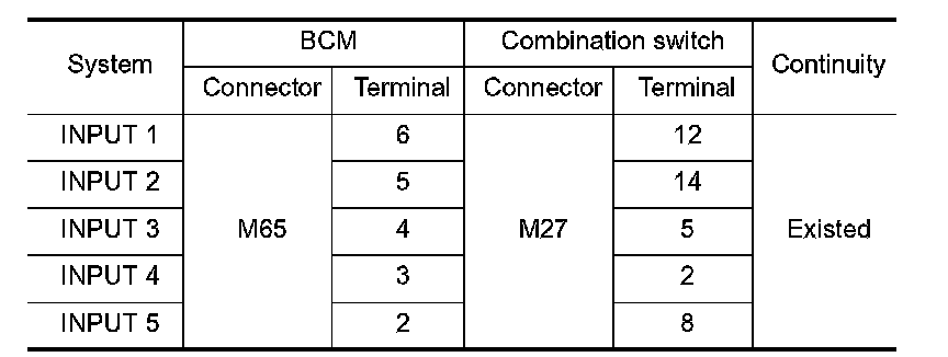 3. Check continuity between BCM harness connector and combination switch harness connector.